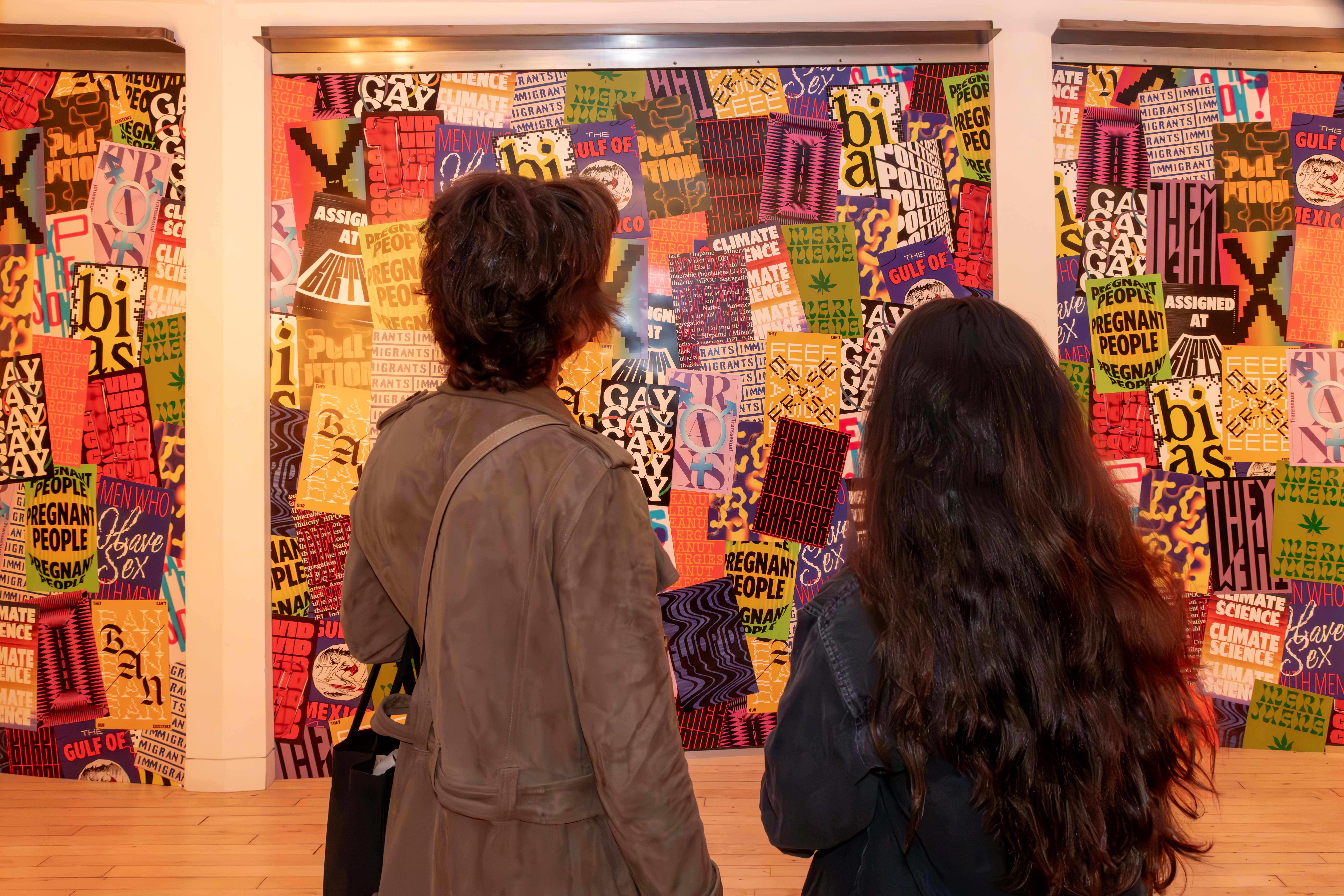 Nearby stood the Riot Wall—a layered installation of typographic posters showcasing outlawed, distorted, and weaponized words.