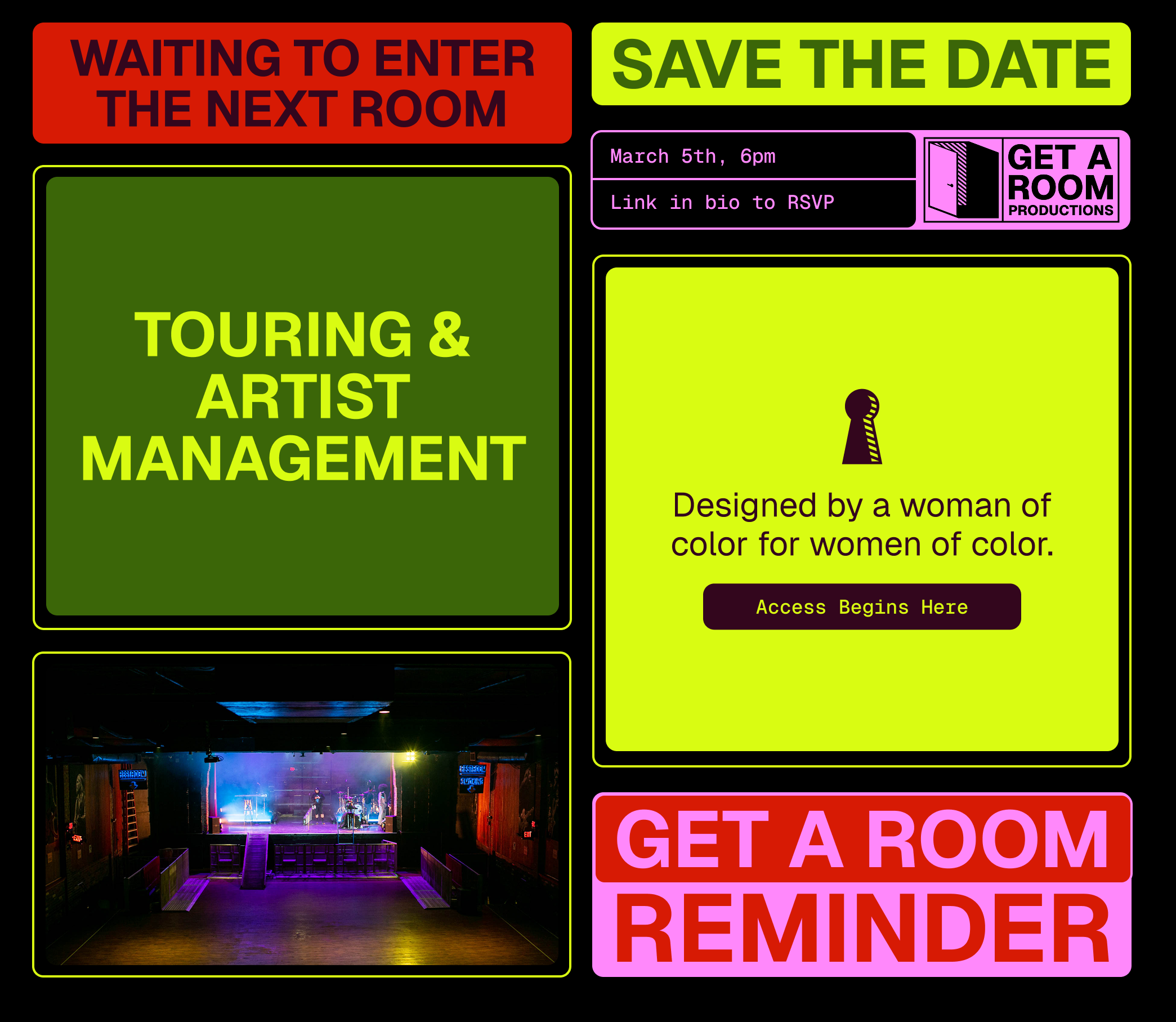 Get a Room Productions is a touring an artist management company founded by Felicia Bennett. As a woman of color, Bennett’s mission is to open doors for POC women in the entertainment industry and provide them with support and education to succeed. Through tour management, consulting, and training curriculums, Get a Room fosters meaningful engagement and unforgettable live experiences.